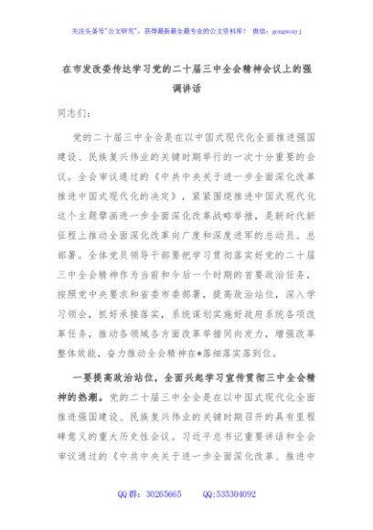 / 在市发改委传达学习党的二十届三中全会精神会议上的强调讲话