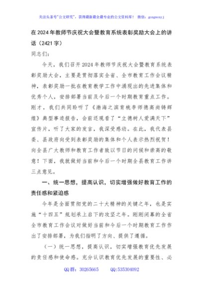 / 在2024年教师节庆祝大会暨教育系统表彰奖励大会上的讲话(2421字)
