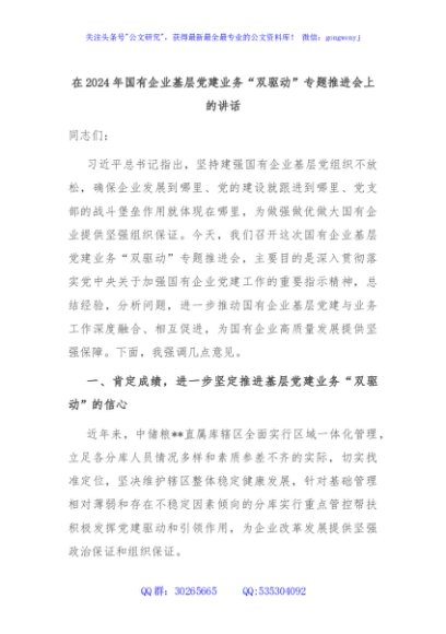 / 在2024年国有企业基层党建业务“双驱动”专题推进会上的讲话