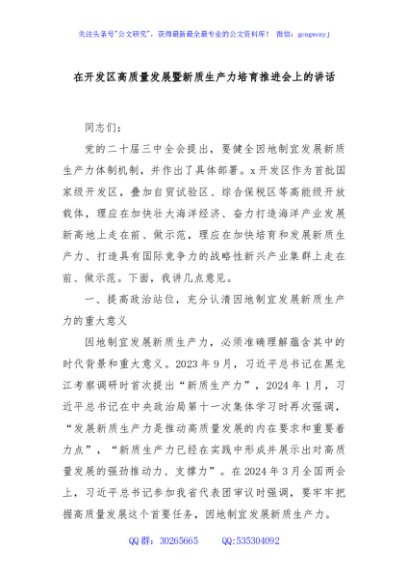 / 在开发区高质量发展暨新质生产力培育推进会上的讲话