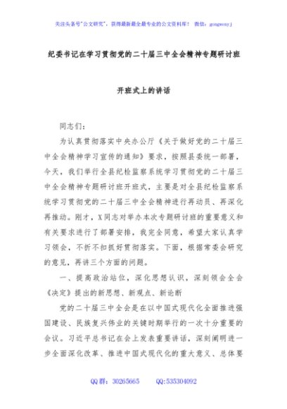 / 纪委书记在学习贯彻党的二十届三中全会精神专题研讨班开班式上的讲话