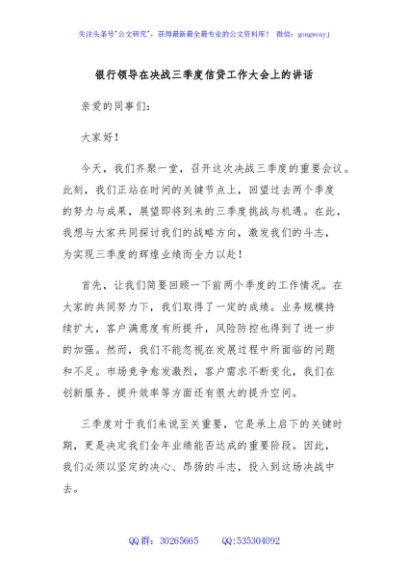 / 银行领导在决战三季度信贷工作大会上的讲话