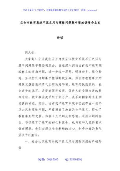 / 在全市教育系统不正之风与腐败问题集中整治调度会上的讲话