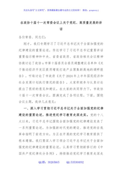 / 在政协十届十一次常委会议上关于党纪、高质量发展的讲话