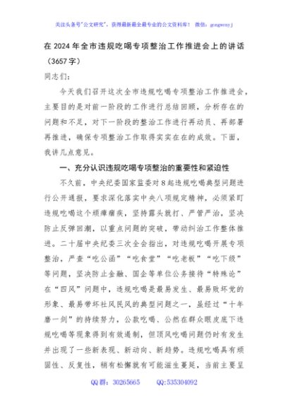 / 在2024年全市违规吃喝专项整治工作推进会上的讲话(3657字)