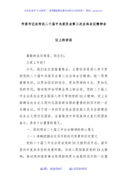 / 市委书记在传达二十届中央委员会第三次全体会议精神会议上的讲话