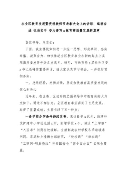 / 在全区教育发展暨庆祝教师节表彰大会上的讲话:砥砺奋进 担当实干 奋力谱写X教育高质量发展新篇章