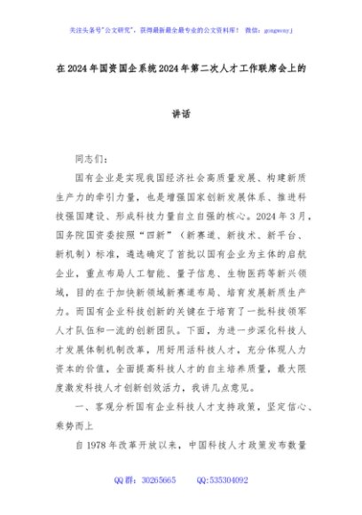 / 在2024年国资国企系统2024年第二次人才工作联席会上的讲话