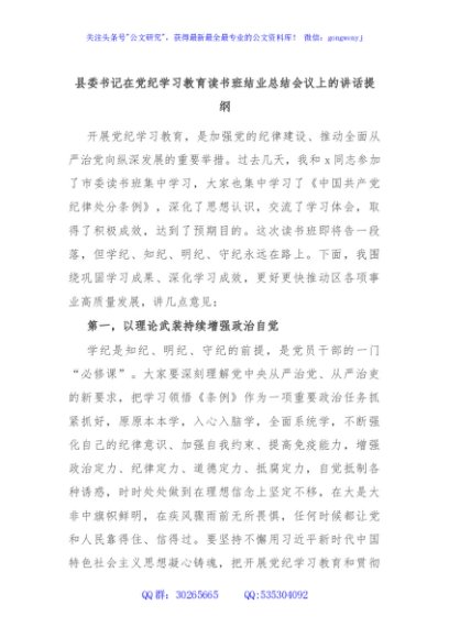 / 县委书记在党纪学习教育读书班结业总结会议上的讲话提纲