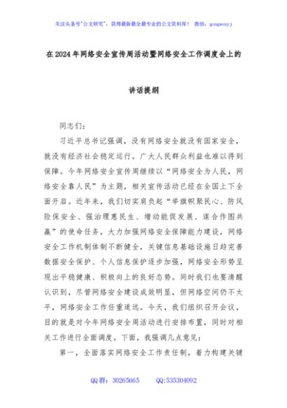 / 在2024年网络安全宣传周活动暨网络安全工作调度会上的讲话提纲