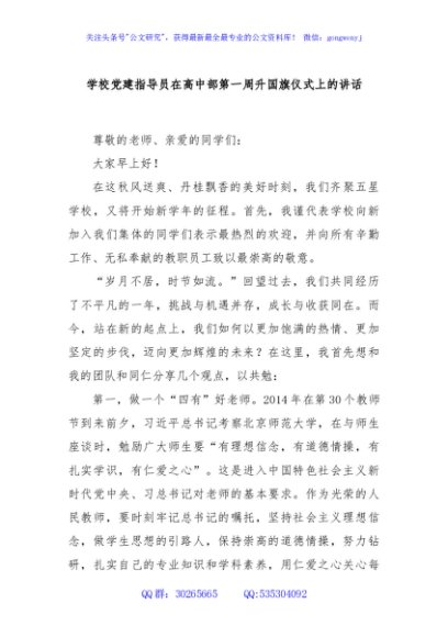 / 学校党建指导员在高中部第一周升国旗仪式上的讲话