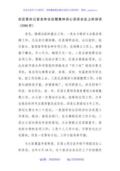 / 在区委办公室全体会议暨集体谈心谈话会议上的讲话(2586字)