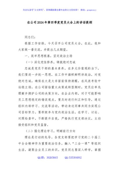 / 在公司2024年第四季度党员大会上的讲话提纲