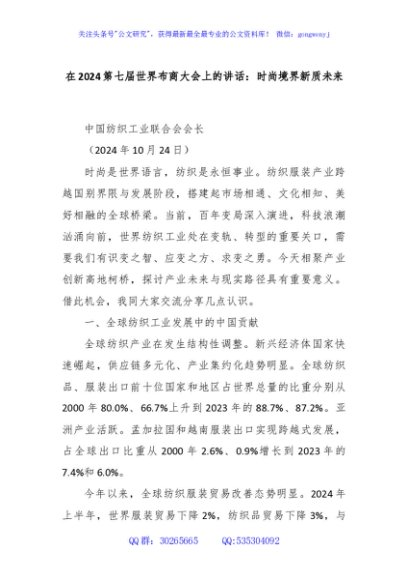 / 在2024第七届世界布商大会上的讲话:时尚境界新质未来