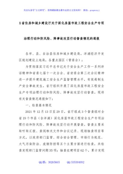 / X省住房和城乡建设厅关于深化房屋市政工程安全生产专项治理行动和防风险、降事故攻坚行动督查情况的通报