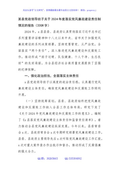 / 某县党政领导班子关于2024年度落实党风廉政建设责任制情况的报告(3308字)