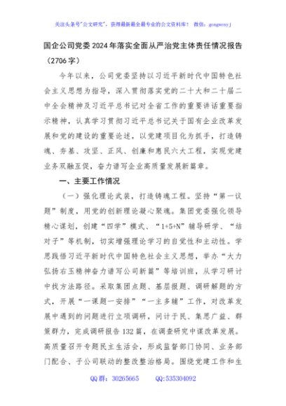 / 国企公司党委2024年落实全面从严治党主体责任情况报告(2706字)