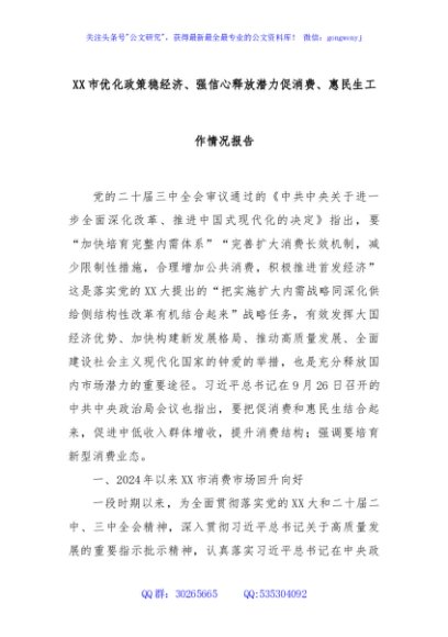/ XX市优化政策稳经济、强信心释放潜力促消费、惠民生工作情况报告
