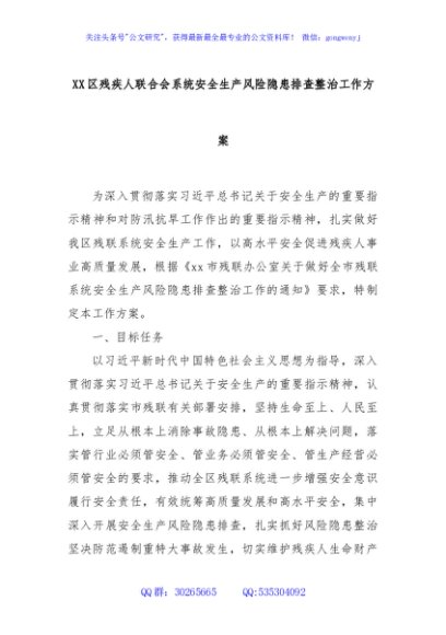 / XX区残疾人联合会系统安全生产风险隐患排查整治工作方案