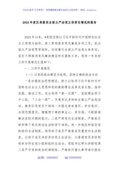 / 2024年度区局落实全面从严治党主体责任情况的报告