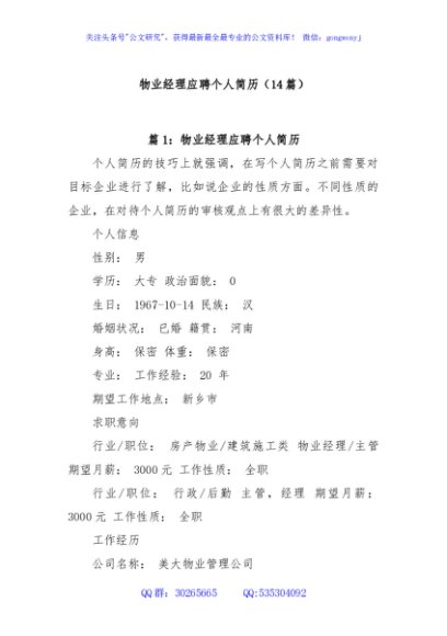 / (14篇)物业经理应聘个人简历