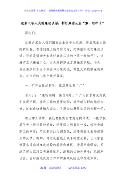 / 致新入职人员的廉政谈话:扣好廉洁从业“第一粒扣子”