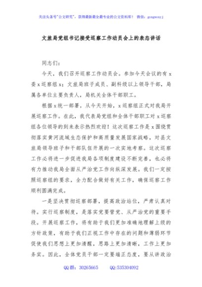 / 文旅局党组书记接受巡察工作动员会上的表态讲话