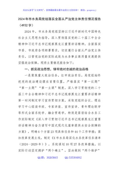 / 2024年市水务局党组落实全面从严治党主体责任情况报告(4932字)