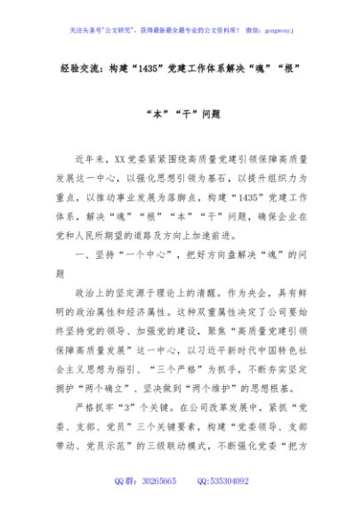 / 经验交流:构建“1435”党建工作体系解决“魂”“根”“本”“干”问题