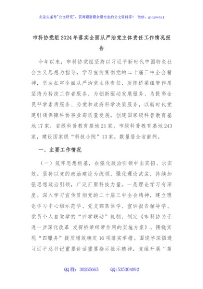 / 市科协党组2024年落实全面从严治党主体责任工作情况报告