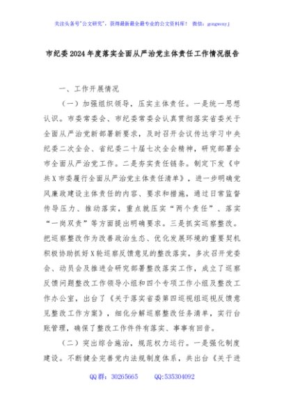 / 市纪委2024年度落实全面从严治党主体责任工作情况报告