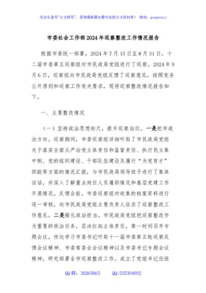 / 市委社会工作部2024年巡察整改工作情况报告