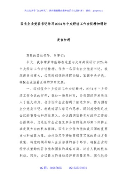 / 国有企业党委书记学习2024年中央经济工作会议精神研讨发言材料