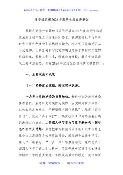 / 县委组织部2024年政治生态自评报告