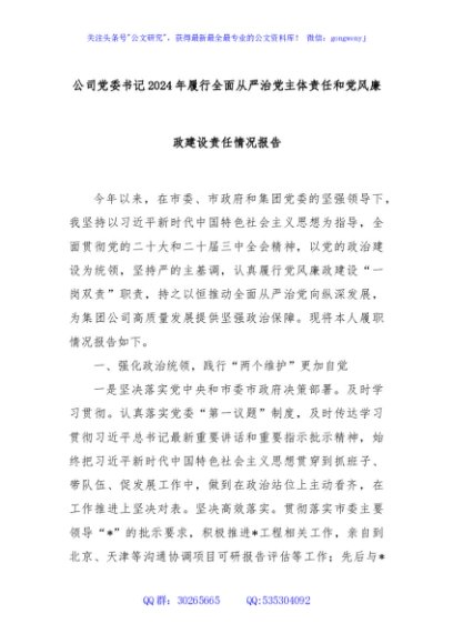 / 公司党委书记2024年履行全面从严治党主体责任和党风廉政建设责任情况报告