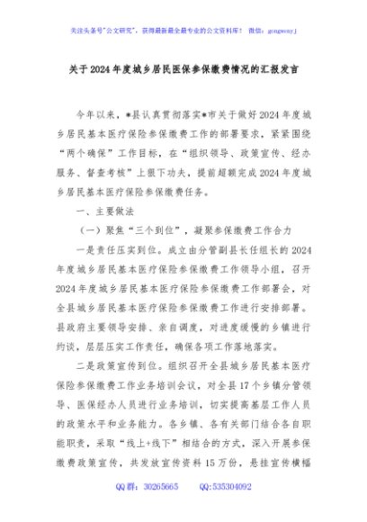 / 关于2024年度城乡居民医保参保缴费情况的汇报发言