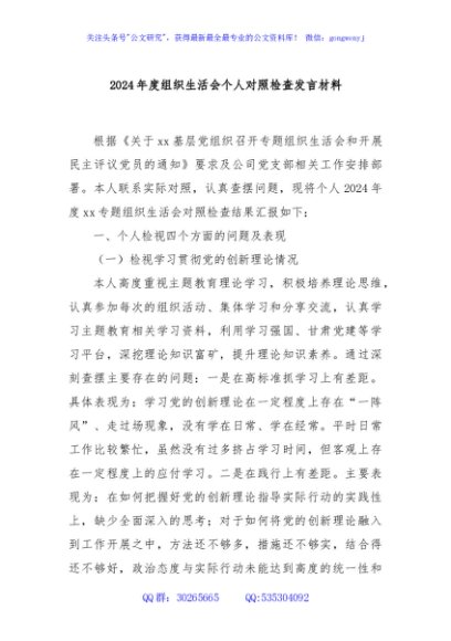 / 2024年度组织生活会个人对照检查发言材料