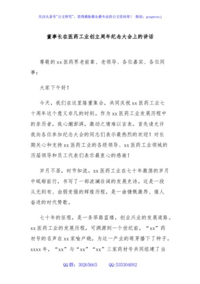 / 董事长在医药工业创立周年纪念大会上的讲话