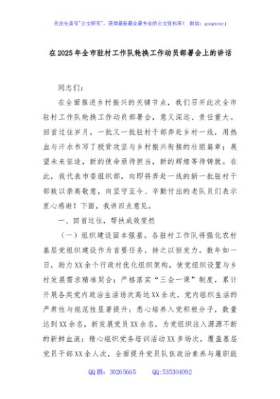 / 在2025年全市驻村工作队轮换工作动员部署会上的讲话