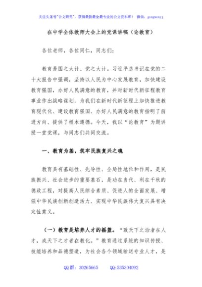 / 在中学全体教师大会上的党课讲稿(论教育)
