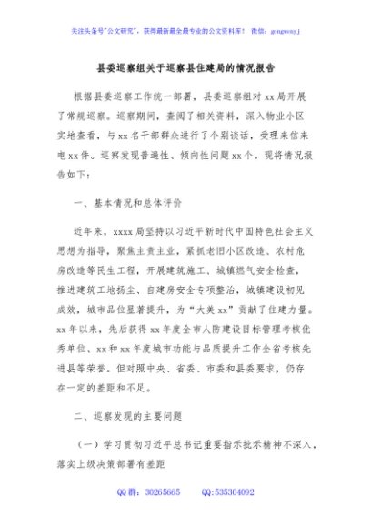 / 县委巡察组关于巡察县住建局的情况报告