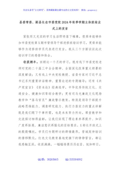 / 县委常委、副县长在市委党校2024年秋季学期主体班结业式上的发言