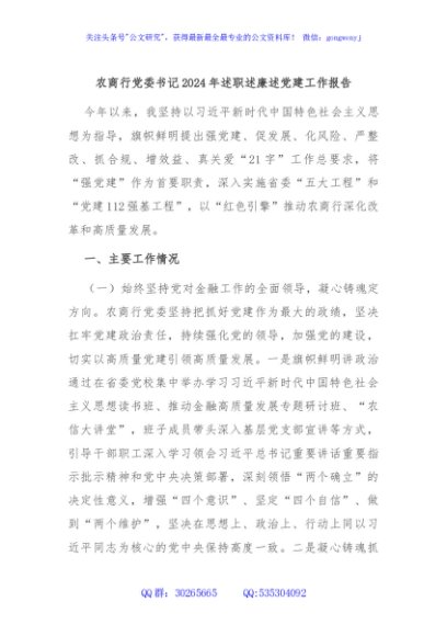 / 农商行党委书记2024年述职述廉述党建工作报告