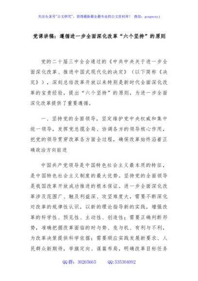 / 党课讲稿:遵循进一步全面深化改革“六个坚持”的原则
