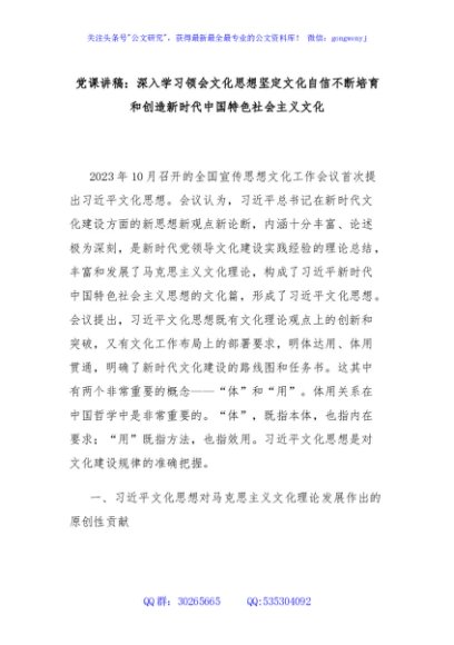/ 党课讲稿:深入学习领会文化思想坚定文化自信不断培育和创造新时代中国特色社会主义文化