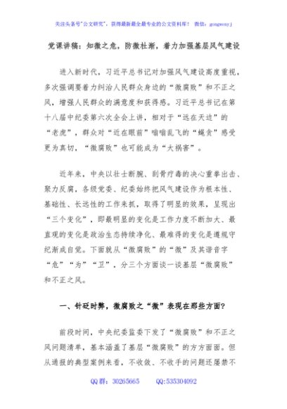 / 党课讲稿:知微之危,防微杜渐,着力加强基层风气建设
