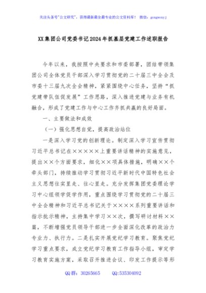 / XX集团公司党委书记2024年抓基层党建工作述职报告