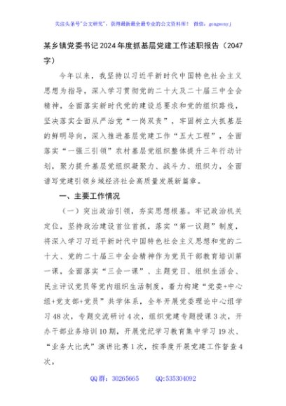 / 某乡镇党委书记2024年度抓基层党建工作述职报告(2047字)