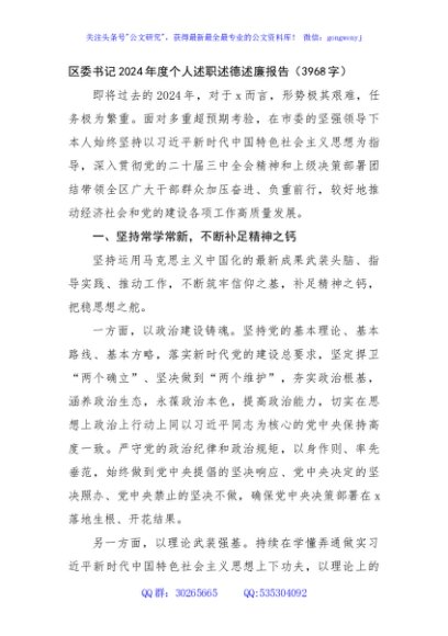 / 区委书记2024年度个人述职述德述廉报告(3968字)