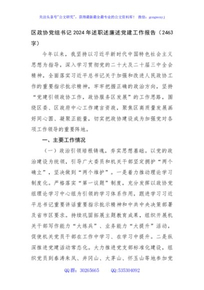 / 区政协党组书记2024年述职述廉述党建工作报告(2463字)